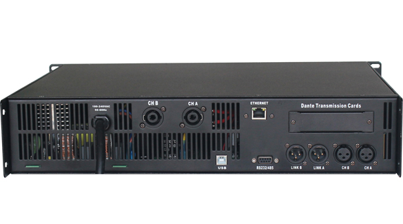 SP-iD215带DSP数字功放 1,前级采用SHARC DSP芯片处理和Dante数字网络音频技术。 2,2通道本地输入,4通道本地输出(其中1、2通道经过DSP处理后直接由本地功放输出,3、4通道则可经过DSP处理后输出驱动其它功放系统)。 3,可扩展的Dante数字网络音频卡支持2个Dante输入通道和2个Dante输出通道。 4,内置4进6出DSP矩阵处理器,全面支持所有本地通道及Dante通道之间路由矩阵及独立的DSP处理功能。 5,内置温度监测、电平侦测、数据反馈、故障报警等多种回馈显示机制,可以通过网络或RS232/485等方式接受远程中控系统的实时监测及控制管理。 6,每通道具有音量、静音、高低切、PEQ均衡、躁声门、压缩、延时等处理功能 7,功率级采用高效的Class-D拓扑架构并集成开关电源设计,功率输出强劲、绿色节能环保。 8,前面板具有LED屏显示及精准增益控制,具有电源、信号、保护和消波的工作信号灯。 9,每通道独特全自动保护电路设计,保护功能有直流、过热、过载以及限幅。 8Ω立体功率:2X1500W 4Ω立体声功率:2X2800W 输入连接器:XLR母 输入阻抗:20KΩ平衡 输入灵敏度:0.77V 1.44V 输入共态抑制比:>80dB 输出连接器:Speakon座 信噪比:>112dB 阻尼系数:> 1000 @ 8Ω 总谐波失真:<0.1%(20 Hz-20 kHz 1W) 频率响应:20Hz-34KHz(+0/-0.3dB,1W/8Ω) 电平调节:前板电位器, 从负无穷到0dB 冷却方式:无级调速风扇,气流由前到后 功放保护方式:短路、断路、直流电压、过热、过压、射频、超低频保护 电源规格:交流电压180-240V 50-60Hz 机箱尺寸(高*宽*长):88mmX440mmX370mm 包装尺寸(高*宽*长):150mmX600mm×550mm 净重:12kg 毛重:15.1kg