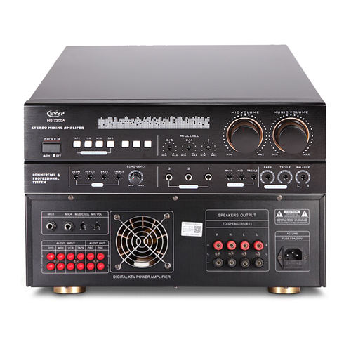 输出功率 : (8Ω) 2 × 200W 2×250W (4Ω) 2 × 250W 2×400W 频率范围 Frequency respone: 20HZ-20KHZ +-0.5dB 信噪比 Signal noise ratio: 82 dB 输入灵敏度 Input sensitivity: 0.18V 总谐波失真 THD: ≤0.05% 输入阻抗 Input impendance : 20KΩ 消耗功率 Supply power: 500W 外形尺寸 Machine dimensions: 430×390×145mm 包装尺寸 Carton size: 490×430×180mm