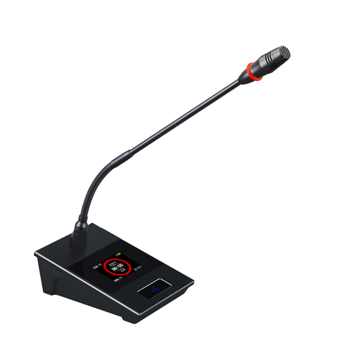 *话筒具备高强度防手机电磁波干扰设计,可以杜绝手机干扰噪音邻频干扰抑制; *主席话筒具备优先功能,一键关闭所有开启中的代表话筒; *话筒具有IPS彩色显示屏,特有广视角、色彩艳丽,实时显示话筒状态:剩余电量、ID号、使用频道以及发言时间计算; *内置大容量充电式锂电池,一次充电可待机13小时,连续使用时间达8小时,话筒使用不分正反面TYPE-C接口充电,标配5V充电器(选配20孔充电机); *话筒表面使用哑光黑铝合金面板,搭配黑色有机玻璃,银白色倒边,靓丽优雅,坚固耐用; *隐藏式简洁话筒开关,防尘易清理,话筒打开后图标亮起,具有持久耐用,按键清晰; *配备专业高保真、单一高指向性电容咪芯,可插拔式咪杆,声音洪亮清脆,增加高速反馈抑制器可增加拾音距离至50M-80CM;