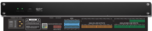 模拟输入通道:12 模拟输出通道:8 处理器:ADI SHARC 21489@450 MHz SIMD; DSP处理能力:400 MIPS,1.6 GFLOPS; 采样率:48 kHz,± 100 ppm; 动态范围(A/D/A):>107 dB,A加权; THD + 噪音:<-90 dB (22.4 kHz BW,不加权);1 kHz @+18 dBu带0 dB增益; 内置一进一出的USB声卡,支持音乐播放、录制和软视频会议(如:ZOOM,腾讯会议,钉钉会议等); 总线式AEC,尾长时间:512ms,收敛率:60dB/S, 回声消除幅度:60dB; 独立通道的AFC(反馈抑制),采用陷波式算法,传声增益提升幅度:10dB; 噪声抑制(ANS),信噪比提升18dB 8段英式参量均衡,提供5种滤波器选择:Parametric,Lowshelf,Highshelf,Lowpass,Highpass; 提供终端用户订制操作界面,最大支持30台设备同一个界面管理; 具有中央控制功能,可对系统中的电源、信号切换、环境控制、音频等整体控制,实现一键开启系统所需要的功能。