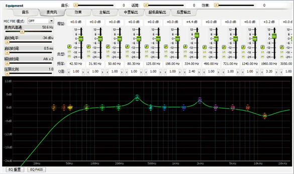 5.1数字机 此系列产品是具有音箱处理器功能的卡拉OK效果器,每部分功能都独立可调; 采用先进的24BIT数据总线和32BIT DSP架构; 音乐输入通道设有7段参量均衡; 麦克风输入通道设有15段参量均衡; 主输出设有5段参量均衡; 中置、后置和超低输出均设有3段参量均衡; 麦克风设3级反馈抑制器,可选择开/关; 可预先储存16种模式; 所有输出通道均设有压限器、延时器; 内设管理者模式和用户模式; 拥有完美的PC端软件,非常直观的均衡器曲线图 超强防冲击电路设计,更好的保护您的设备。