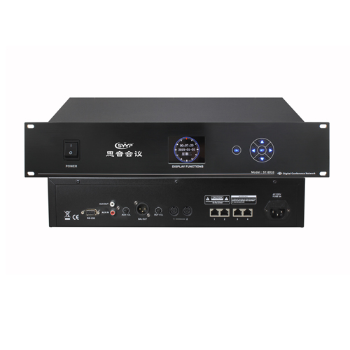 1.主机自带2.8寸高清彩色液晶显示屏,独立按键操作,简单明了。 2.主机在等待操作期间,会自动切换到高清时钟界面,实时显示当前时间。 3. 采用数字集成电路技术,内置高性能CPU,低功耗、高保真、极稳定; 4. 主机同时具有4路网线接口和2路八芯接口,用于连接会议单元。 5. 七种发言人数可选:1-6(人可选 )、N(全开放)。 6.具有限时发言功能,可设定发言人的发言时间,到时自动关闭话筒。 7.多种发言模式:先进先出模式、主席专用模式、全开放模式等。 8.断电智能记忆功能,可记忆程序原运行状态。若意外断电后,通电即恢复最后一次设置; 9.具有中/英文语言切换功能; 10.主机可连接80个会议话筒单元,增加扩展主机最多可以连接512个会议单元。 11.具有声控开咪功能,发言人不需要在发言前进行任何操作,会议单元在识别到有声音输入时,自动开启。 12.具有辅助输入输出功能:辅助输入可连接如手机、电脑等外部音源,辅助输出可连接外部录音设备或把声音输出给远程视频会议终端。 13.输入输出的音量大小可调节。 14.具有RS-232接口,可连接中控系统或电脑,支持232协议代码控制,令会议设备智能化。 15.具有双重防雷功能,能在一定程度上防止雷电引起的电涌对系统主板的损坏。