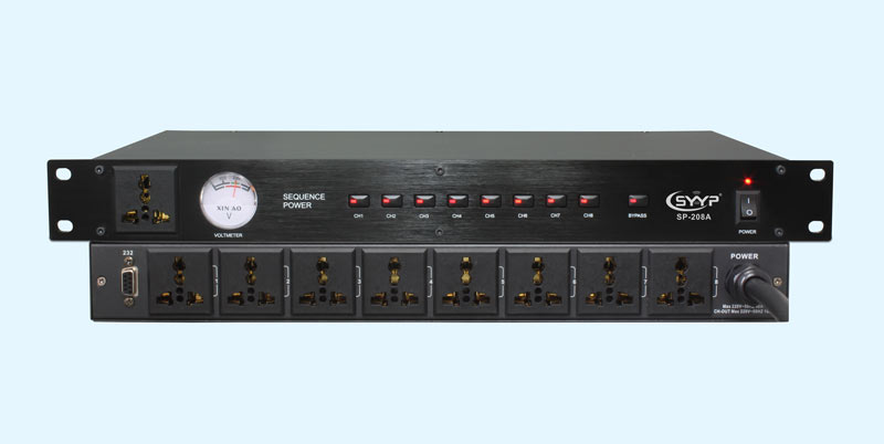 时序器功能介绍: 本产品适合于音响工程、电视广播系统、会议室及电力设施场合需要按次序电源分配系统的场合。 电源时序器能够按照前级到后级逐个顺序启动设备,有效统一管理控制各类用电设备,避免人为失误操作,从而确保用电系统的稳定性和操作的简便性。 本厂生产的电源时序器采用高纯度鳞铜万能插座,耐磨导电性强,而不采用杂质较多的黄铜,采用大品牌12V电流继电器30A/250V,名牌大厂继电器的选用,加上可靠的灭弧电路,令到继电器的触点温升特别小,寿命长,整个系统非常可靠。3芯*6平方3C认证专业电缆。每一通道能受得起AC220V,13-20A电流,线路板采用双面板SMT贴片技术2安铜高精密度板材制作。每一台电源时序器都能受得起4-8台,600-2000W专业功放,整机正常使用3000-5000W功率。 时序器参数: 1、 输入电源:交流110V~220V 50Hz~60Hz 2、 控制电量:每路最大输出电流30A 3、 额定输出电压:交流220V/50Hz 4、 可控制电源:8路 5、 不可控制电源:1路 6、 每路动作延时时间: 默认1.5秒(1-4.5S可调) 7、 电源开关控制电源